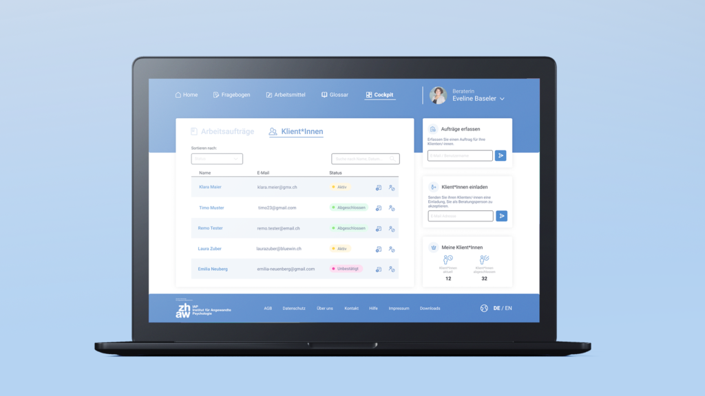 Die Plattform Laufbahndiagnostik unterstützt Klient:innen und Beratende, systematisch eine günstige Ausgangslage für ein zufriedenes Berufsleben zu schaffen. Beratende und Klient:innen dürfen nun auf eine konzeptuell und visuell optimierte Plattform zugreifen. Dank der tollen Zusammenarbeit mit den Betreibern vom Institut für Angewandte Psychologie IAP der Zürcher Hochschule für Angewandte Wissenschaften ZHAW und unserem Entwicklungspartner Simplificator AG konnten wir einen wichtigen Schritt machen.